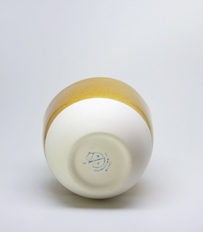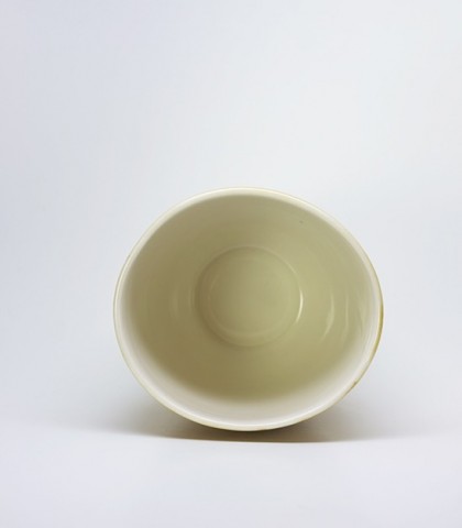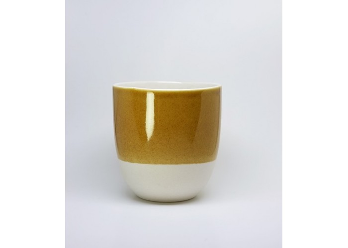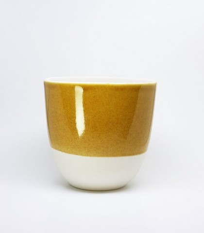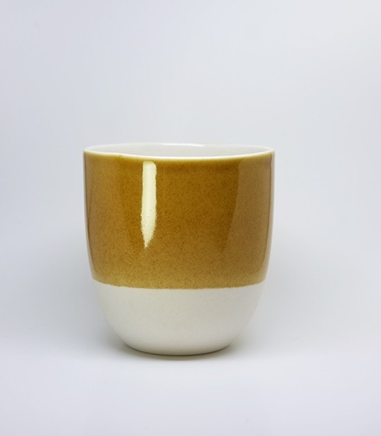 Vaso de porcelana con esmalte amarillo de manganeso. Prueba con una pizca más de sílice.